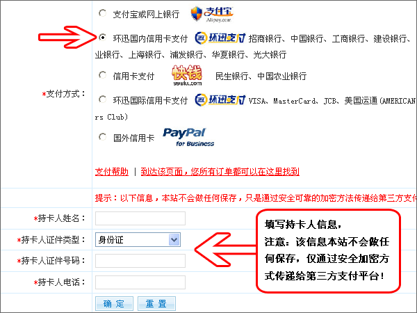 1.支付寶或網(wǎng)銀支付 2.環(huán)迅國內(nèi)信用卡支付 3.快錢國內(nèi)信用卡支付 4.銀行匯款
