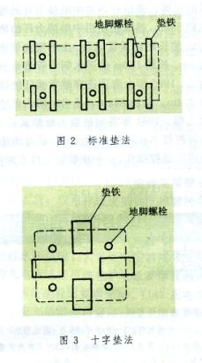 墊鐵一般應(yīng)在靠近地腳螺栓的兩側(cè)安放,稱標準墊法(圖2)。根據(jù)設(shè)備底座的大小、構(gòu)造型式和地腳螺栓間距的不同,還有不同的墊法。例如:當設(shè)備底座小i地腳螺栓間距較近時,可采用在兩根地腳螺栓之間只安放一組墊鐵的十字墊法(圖3);當?shù)啬_螺栓間距較遠時,除采用標準墊法外,還需采用在中間增加一組墊鐵的輔助墊法;對大型設(shè)備可根據(jù)底座形狀和地腳螺栓間距的大小,采用包括標準墊法、十字墊法和輔助墊法的混合墊法。