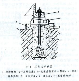 壓漿法 利用螺栓調(diào)整墊鐵壓緊灌漿層并對設(shè)備安裝進行精調(diào)整,使墊鐵與設(shè)備底座及灌漿層緊密接觸的施工方法。其作法是:在地腳螺栓的適當位置上焊一根小圓鋼作為螺栓調(diào)整墊鐵的支承,當設(shè)備用臨時墊鐵安裝初步找平后進行二次灌漿,同時在設(shè)備底座與小圓鋼中間裝入調(diào)整墊鐵,在灌漿層達到初凝后調(diào)整墊鐵的升降塊壓緊設(shè)備底座底面和灌漿層,當灌漿層達到規(guī)定強度的75%以后拆除臨時墊鐵,再用螺栓調(diào)整墊鐵精調(diào)設(shè)備的水平度和標高(圖4)。